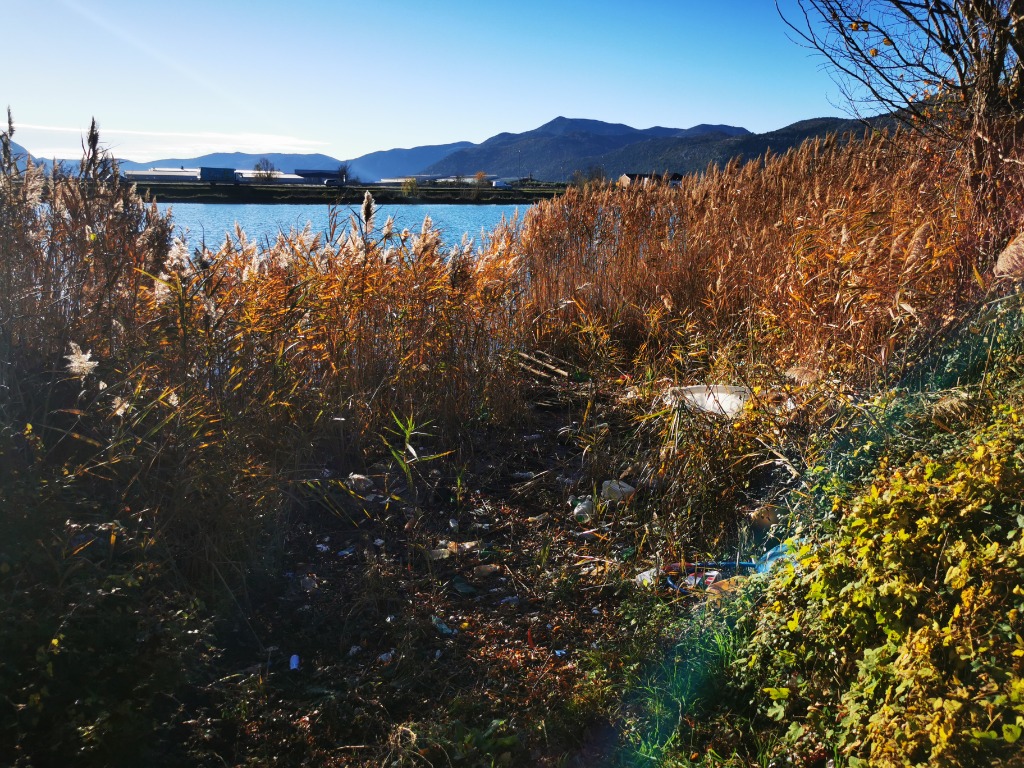 Opis: Nakupine plastičnog otpada na kraju šetnice u Metkoviću. Dužine 50 - 100 metara (možda i duže), velik broj različitih žarišta, trstika lovi otpad.